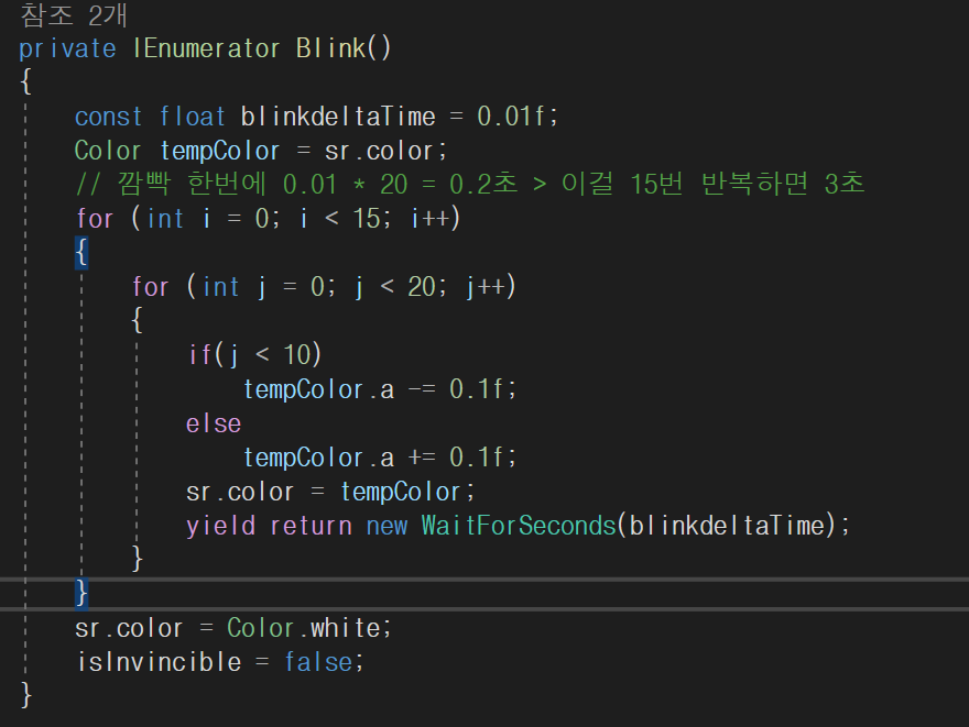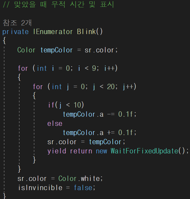 피격 후 3초 간 무적, 그 표시로 캐릭터 깜빡임을 코루틴으로 아래와 같이 처리하였습니다.